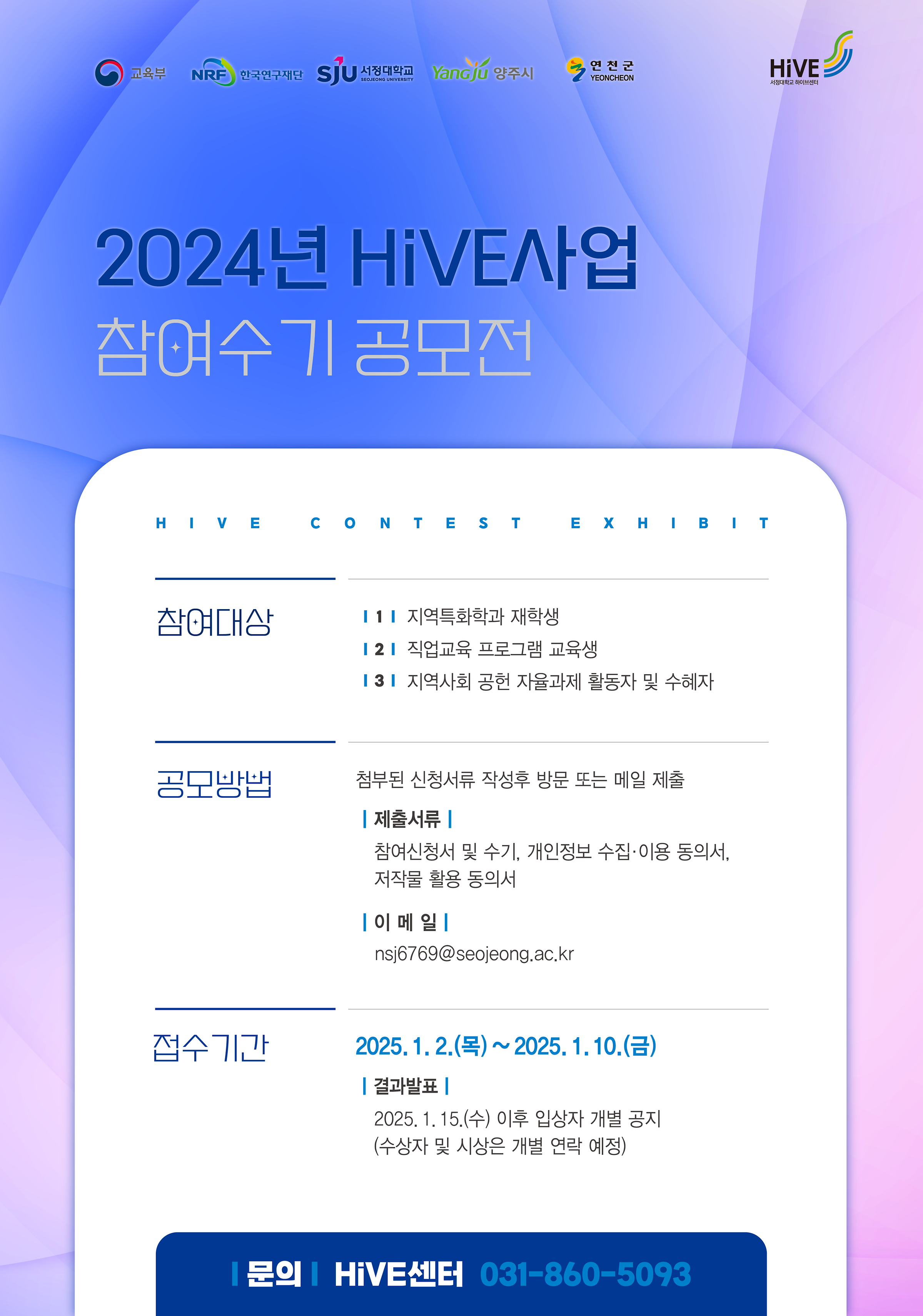 2024년 HiVE사업을 통해 얻은 여러가지 소중한 경험과 프로그램 참여를 통해 성장한 이야기, 지역사회 공헌 자율과제를 통해 나눔과 성장을 경험한 이야기를 함께 공유하고 앞으로의 삶에서 큰 영감을 줄 수 있는<2024년 HiVE사업 참여수기 공모전>을 진행하려고 합니다.
