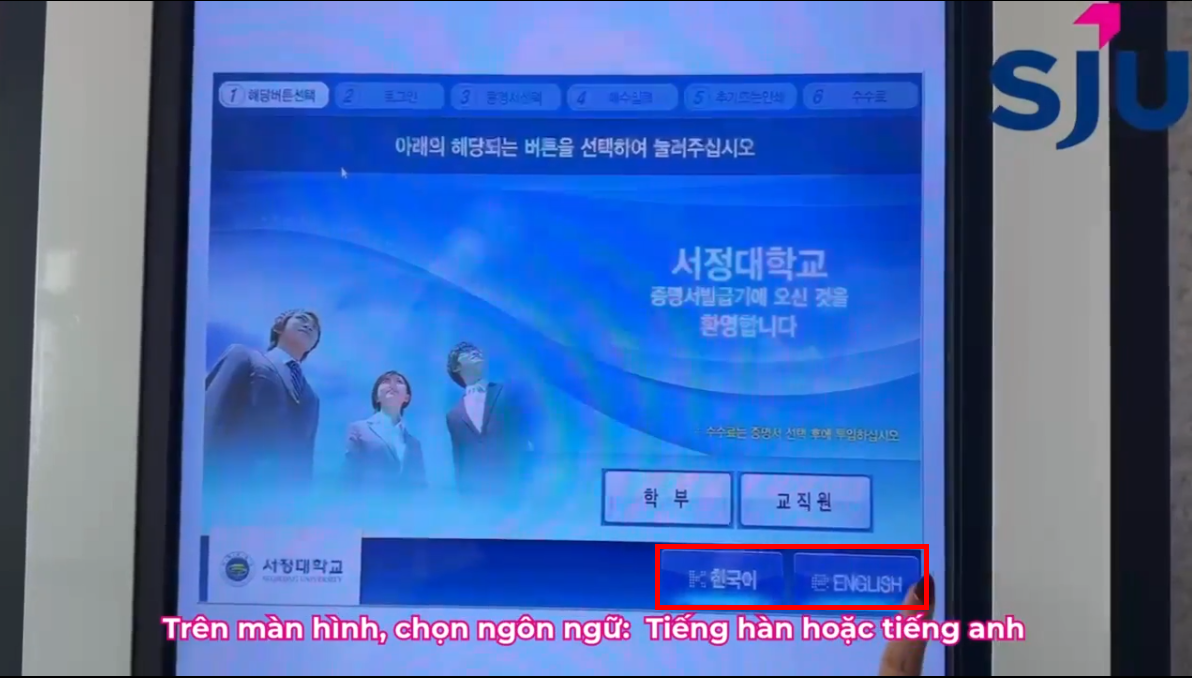 ① Trên màn hình, chọn ngôn ngữ: Tiếng Hàn hoặc tiếng Anh
