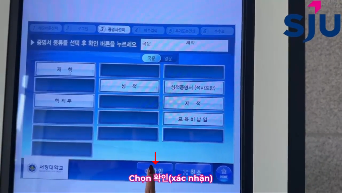 ⑤ 재학증명서 (giấy chứng nhận đang học tại trường) > Chọn 확인 (xác nhận)