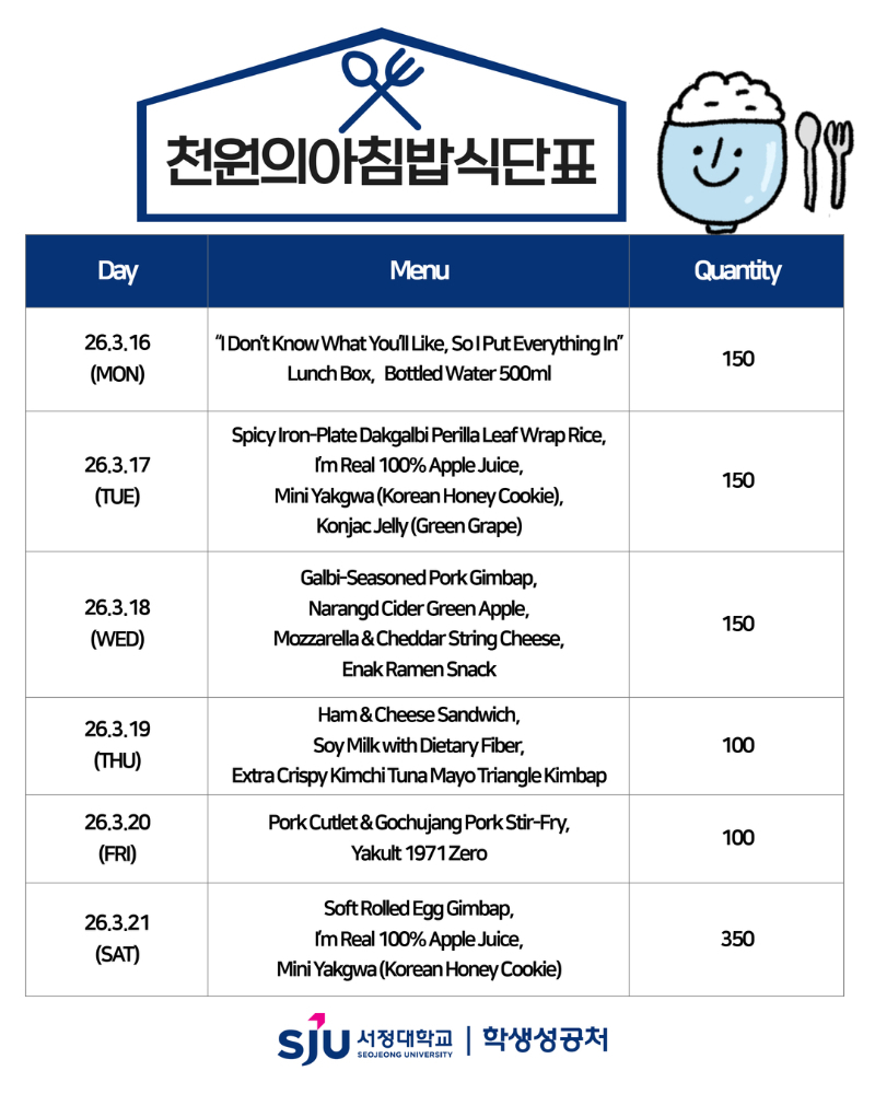 [식단표(천원의 아침밥)] 3월 3주 천원의 아침밥 메뉴 안내 N