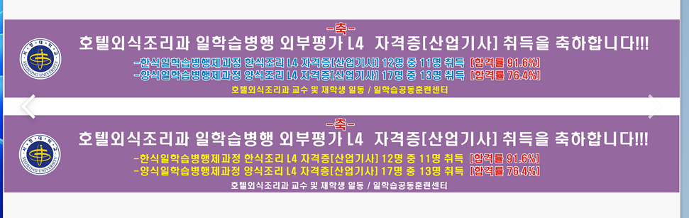 -한식일학습병행제과정 한식조리 L4 자격증(조리산업기사) 12명 중 11명 취득(합격률 91.6%) 합격자명단: 주*하/이*호/김*빈/윤*민/이*연/심*영/김*성/권*용/황*현/이*진/김*혁 -양식일학습병행제과정 양식조리 L4 자격증(조리산업기사) 17명 중 13명 취득(합격률 76.4%) 합격자명단: 장*빈/이*혁/송*훈/박*영/정*민/정*수/정*호/이*석/박*연/김*영/강*건/박*진/김*섭