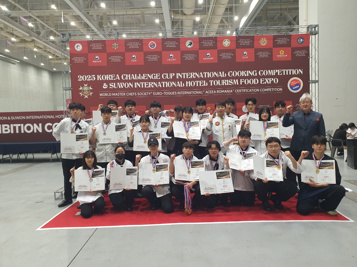 서정대학교 호텔외식조리과 학생들이 지난 9일~10일 수원컨벤션센터 전시장에서 열린 2025 대한민국 챌린지컵 국제요리경연대회에서 개인 전시요리부문에 총 27명이 참가해 교육부장관상을 비롯해 금메달 18개, 은메달 9개를 수상했다.