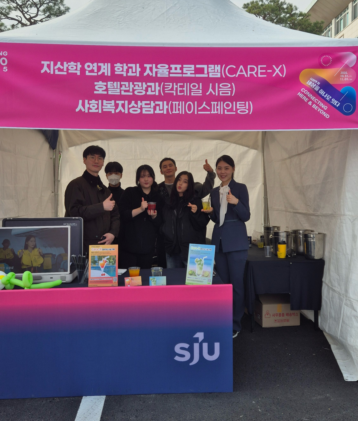 1. 2025학년도 용암제 성과 10.31(금) 학과부스 운영 라운딩 수상 11.01(토) 학과부스 운영 라운딩 수상 11.01(토) 성인학습자 영상공모전 최우수상 수상 : 성인학습자 이경희 11.01(토) 산업체 위탁 영상공모전 최우수상 수상 : 안산 위탁교육장 2. 2025학년도 서정EXPO ‘찾아가는 나눔카페’ 운영 서정대학교 호텔관광과는 전문대학 혁신지원사업의 일환으로, 10월 31일(금) 서정EXPO에서 CARE-X ‘찾아가는 나눔카페’를 운영했습니다. 이번 프로그램은 혁신지원사업단이 주최하고 대외협력처가 주관하였으며, 교직원 및 재학생을 대상으로 칵테일(모히또 및 데킬라선라이즈) 시음체험 및 학과 인스타그램 팔로우 이벤트 등을 진행한 활동이었습니다.