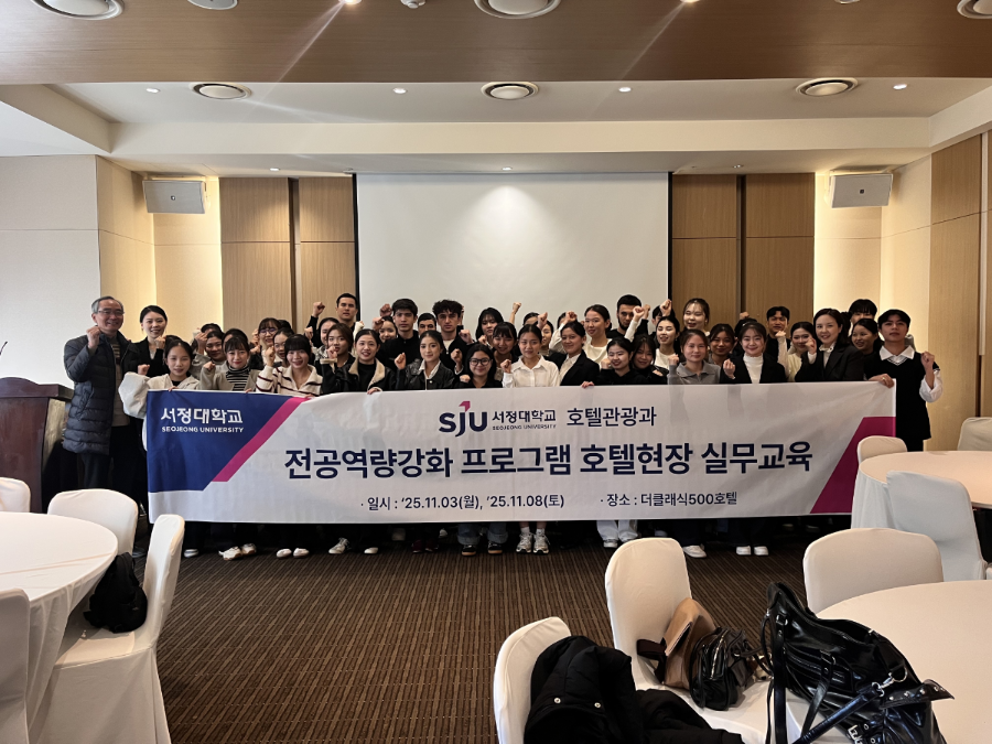 서정대학교 호텔관광과는 전문대학 혁신지원사업의 일환으로, 11월 3일(월), 11월 8일(토) 더클래식500 펜타즈호텔에서 ‘2학기 전공역량강화 호텔현장 실무교육’을 진행했습니다. 이번 프로그램은 혁신지원사업단이 주최하고 교수학습지원센터와 호텔관광과가 주관하였으며, 호텔 객실 및 주요 부대시설 투어, 식음료 및 테이블 매너 등을 체험할 수 있는 활동이었습니다.