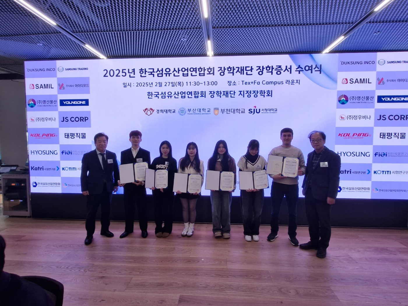 한국섬유산업연합회는 영원무역, 효성티앤씨, 영신물산 등 15개의 국내 섬유무역 제조업체 및 섬유 시험연구원의 후원과 더불어 국내 대학 및 대학원에서 섬유전공하는 학생들 가운데 장학생을 선발해왔다. 올해 처음으로 섬유전공 외국인 유학생들에게도 장학생 선반 대상을 확대해 서정대학교에서 섬유전공 외국인 유학생 6명을 선발하였다.서정대학교는 2024년부터 글로벌산업공학과 내에 섬유전공을 신설하여 국제 학생들을 대상으로 국내 섬유산업의 기술인력수요에 부응하는 교육을 해왔다. 25학년도부터는 글로벌섬유비즈니스과로 확대 개편하여 1차로 30여 명의 신입생을 선발하였다.