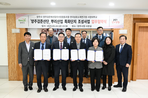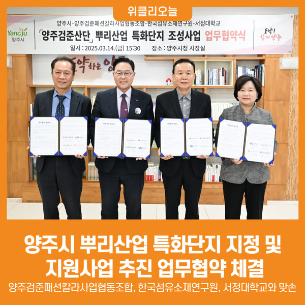 양주시가 14일 오후 시청 집무실에서 양주검준패션칼라사업협동조합, 한국섬유소재연구원, 서정대학교와 함께 ‘뿌리산업 특화단지 지정 및 지원사업 추진’을 위한 ‘업무협약’을 체결했다.
