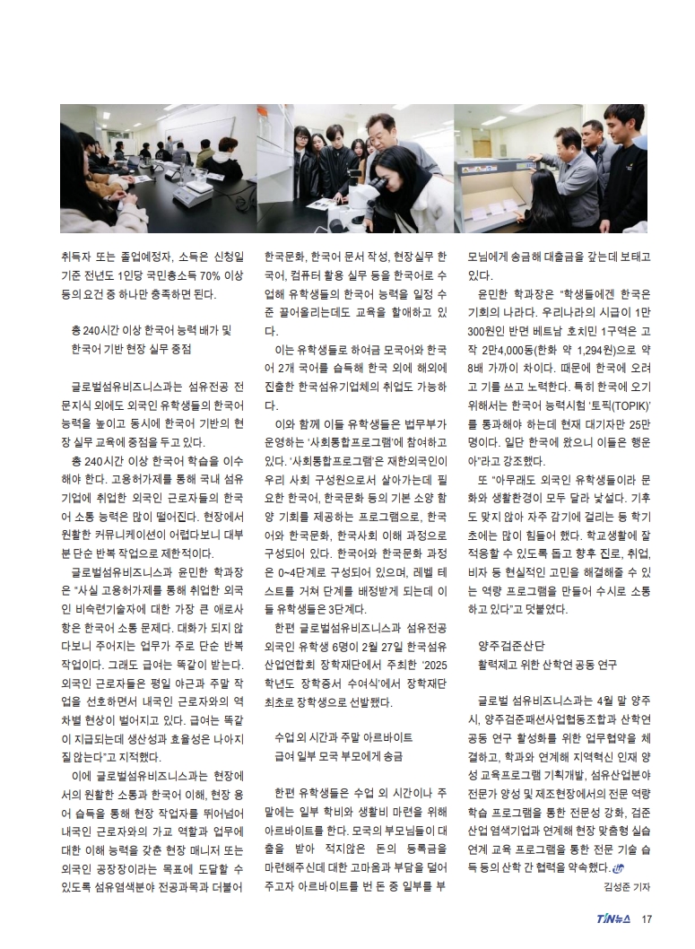 글로벌섬유비즈니스과는 앞으로도 다양한 산업체와의 교류 및 협력을 통해 학생들이 현장 중심의 실무 역량을 키우고, 섬유 산업의 미래를 이끌어갈 전문 인재로 성장할 수 있도록 지속적으로 지원할 예정입니다.