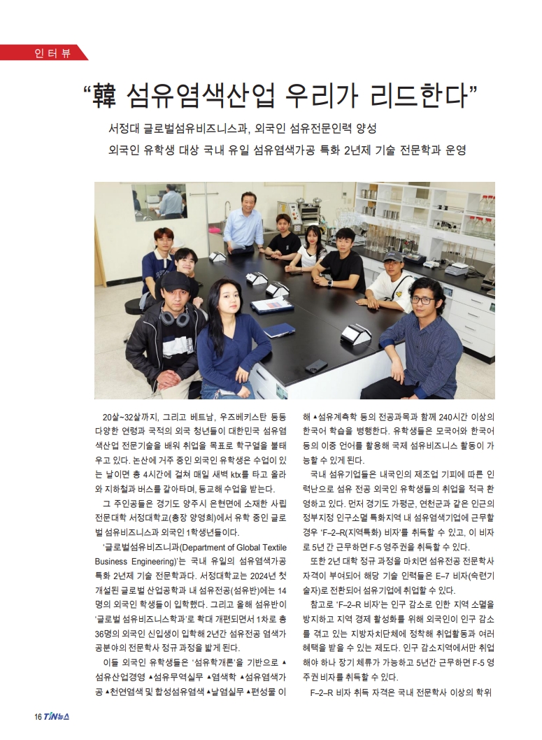 서정대학교 섬유전공 외국인 유학생들의 지도교수이자 글로벌섬유비즈니스과 학과장인 윤민한 교수는 "우리나라 섬유염색가공산업의 기술과 경쟁력은 세계적인 수준이며, 한국섬유 대기업들은 현재 베트남, 방글라데시, 인도네시아, 과테말라 등 아시아 및 중남미 국가로 진출하여 현지 국가들의 섬유산업과 국가 발전에 기여하고 있다"라고 했다.